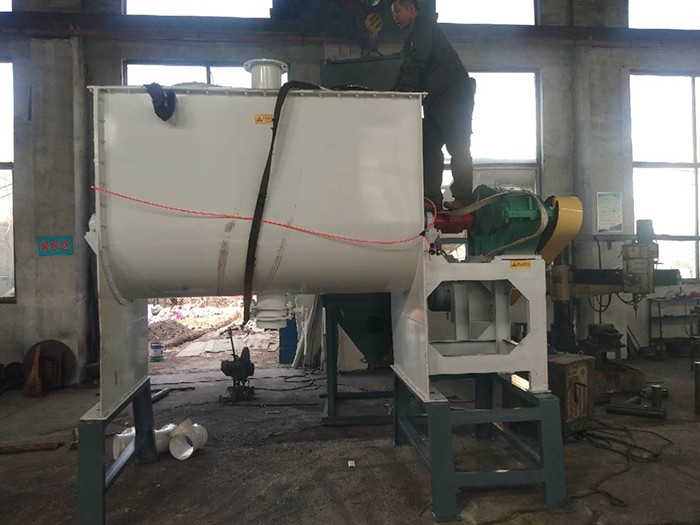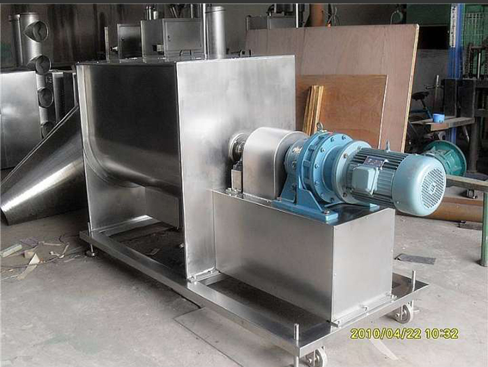 臥式混料機由U形容器、螺帶攪拌葉片和傳動部件組成;螺帶狀葉片一般做成雙層或三層,外層螺旋將物料從兩側(cè)向中間匯集,內(nèi)層螺旋將物料從中間向兩側(cè)輸送,形成對流混合。 螺帶混合機對于粘性或有凝聚性的粉粒體的混合以及粉粒體中添加液體及糊狀物料的混合有良好的效果,筒蓋可做成全開式門,以便于對設(shè)備進行清洗更換產(chǎn)品。